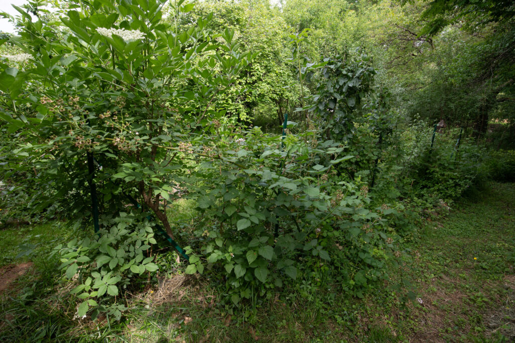 Nous avons également laissé pousser différentes plantes spontanées dans la haie, notamment un prunier et plusieurs sureaux. Ils seront taillés s’ils deviennent trop encombrants.
