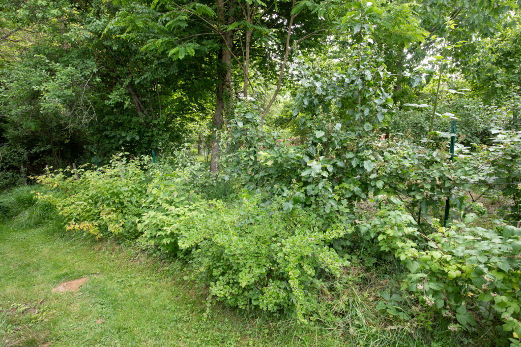 Cinq ans après ses débuts, la haie est toujours présente, mais a évolué. Nous avons acheté le terrain situé derrière à notre voisine en 2024. Elle ne joue donc plus un rôle de séparation, mais est juste une zone de production fruitière en longueur.